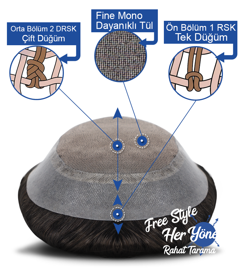 %100 Gerçek insan saçlarından üretilmiş Australia Modeli Protez Saçın orta bölümü fine mono dayanıklı tül olduğundan, hava ve su geçirgenliğine sahiptir. Bu sayede kafa deriniz oksijen alır ve derinizin su ile teması sağlanır. Ön kısımlardaki 1 cm lik bölüm doğallık için RSK tek düğümdür. Bu sayede Saç dipleri ve düğüm yerleri, alın bölgenize %100 Doğal bir görünüm kazandırır. Geri kalan bölümde DRSK çift düğüm kullanılmıştır. 360 derece pu. bantlama bölümü sayesinde her açıdan mükemmel tutuş gücü sağlar. Ön bölümdeki poly, kullanıcının ölçülerine göre kesilebilir.15 cm saç uzunluğuna sahip Free Style Austrlia Protez Saç Modeli ipeksi yapısı ve yönsüz oluşu sayesinde her modele rahatlıklar girer, kolay taranır. İster arkaya tarayın ister yanlara, her durumda da mükemmel sonuçlar alırsınız. Dileğinize göre sprey, wax, saç jölesi kullanabilirsiniz. Daha çok kendi bakımını kendisi yapmak isteyenler için tercih sebebidir.